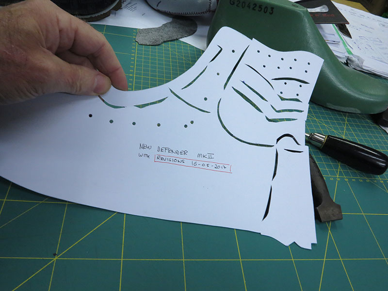The card section patterns are used to cut the leather or fabric pieces for the boot upper. Sample revisions are made and revised uppers are cut many times. This process is repeated until the bootmaker is happy with the sample size of new boot.